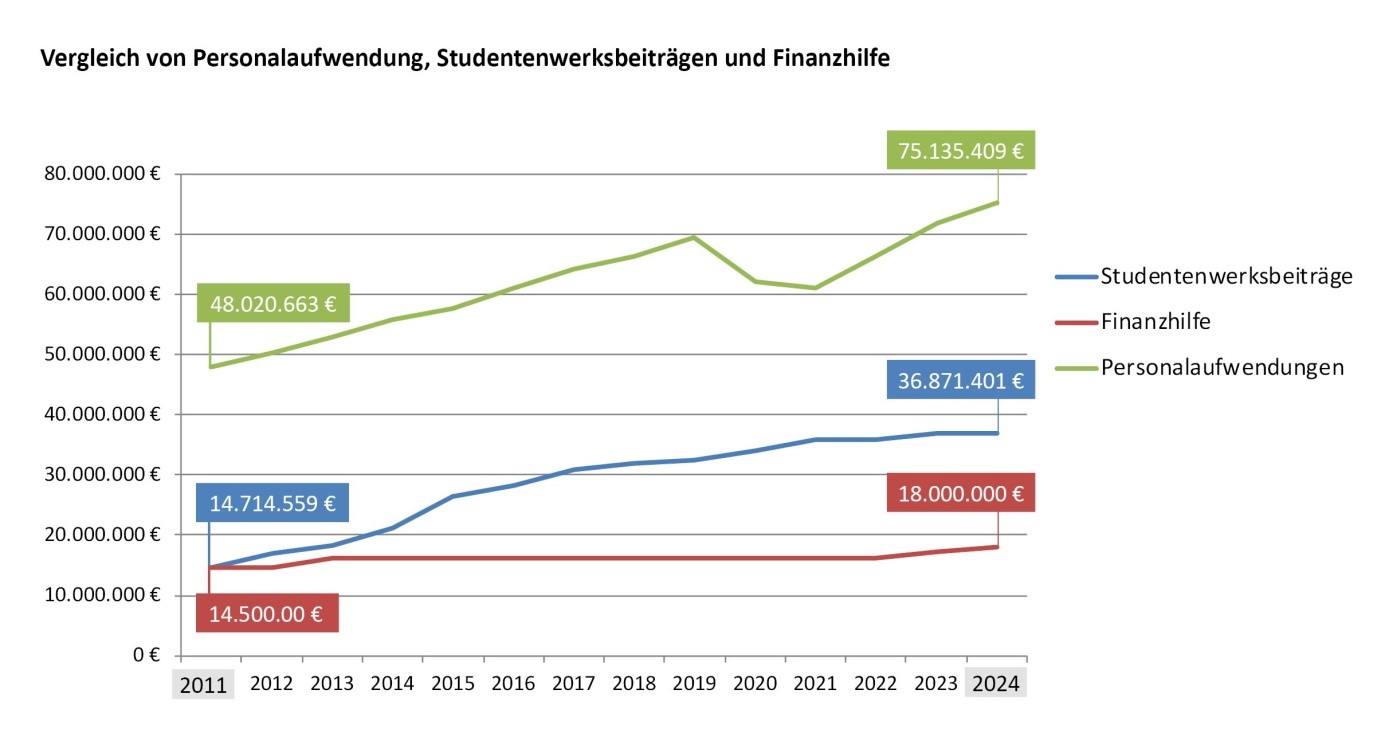 Wir halten eine Anpassung der Finanzhilfe für das Haushaltsjahr 2026 auf 23 Mio. Euro für angemessen (aktuell sind es 18 Mio. Euro). Über die Jahre haben wir relativ konstant ca. 42 % unserer Einnahmen für Personal aufgewendet. Noch 2011 hat die Finanzhilfe rd. 30 % des Personalaufwands finanziert, 2024 waren es nur noch 24 % (s. Grafik). Um den Anteil von 30 % wiederherzustellen, bedarf es der genannten Erhöhung. Diese würde im Übrigen immer noch bedeuten, dass 70 % der Kostensteigerungen von den Studierenden getragen werden. Langfristig brauchen wir eine Dynamisierung der Finanzhilfe, um unseren Auftrag auch in Zukunft erfüllen zu können und Niedersachsen als attraktiven Studienstandort zu erhalten, ohne die Studierenden übermäßig zu belasten.