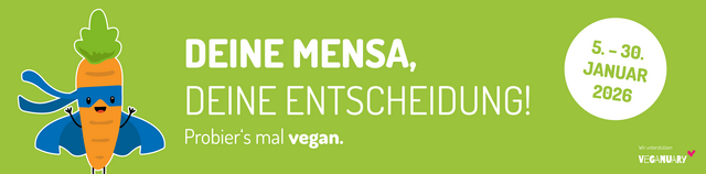 Auch 2026 treten unsere Mensen gegeneinander an. Die Mensa mit der größten Steigerung an verkauftem veganen Essen im Aktionszeitraum (5. Januar bis 30. Januar) gewinnt.